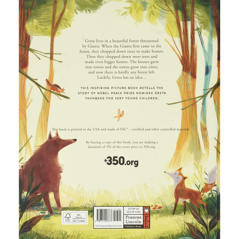 Greta is a little girl who lives in a beautiful forest threatened by Giants. When the Giants first came to the forest, they chopped down trees to make houses. Then they chopped down more trees and made even bigger homes. The houses grew into towns and the towns grew into cities, until now there is hardly any forest left. Greta knows she has to help the animals who live in the forest, but how? Luckily, Greta has an idea…